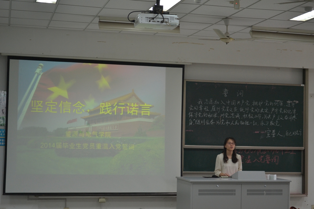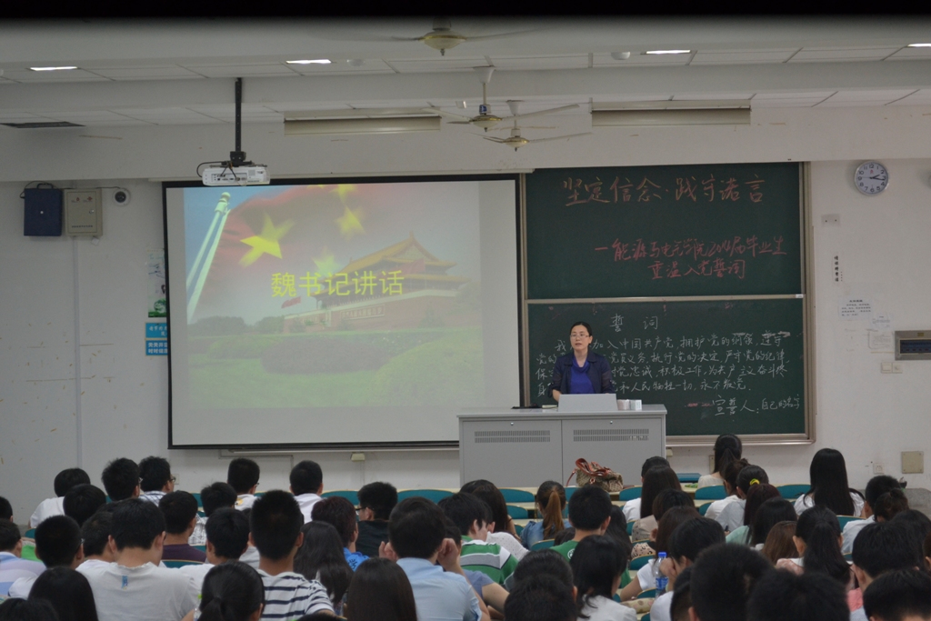 宣誓结束后,魏书记代表学院党委对毕业生党员表示了殷切希望,并指出重温入党誓词,就是希望毕业生党员能够铭记党员的理想信念,增强党员的意识,在走出校园,走向社会后,努力践行党员承诺,始终保持一名党员的先进性,不忘增强党性修养。魏书记提出要谨记习近平总书记对广大青年的希望,积极做到“勤学、修德、明辨、笃实”,并对毕业生党员提出了具体要求,要求毕业生党员要谨记党员的责任与义务,以实际行动回馈社会、奉献他人、报效祖国;要坚持正确的理想与信念,坚持理论学习,在纷繁的社会里时刻保持党员的先进性;要坚守思想的阵地,坚决抵制消极腐朽的思想观念,明辨是非,分清善恶;要做到业务精能力强,勇于奋斗,敢于拼搏,踏踏实实做事,勤勤恳恳做人,忠诚于国家忠实于党;要实现人生价值和社会价值的双赢,努力践行社会主义核心价值观,在未来的工作中遵照社会主义核心价值观的要求,展开人生的抱负。最后魏书记对毕业生党员表达了美好的祝愿,希望同学们传承河海的精神,牢记今日的誓词,践行党员承诺,坚定信念理想,创造明日辉煌。