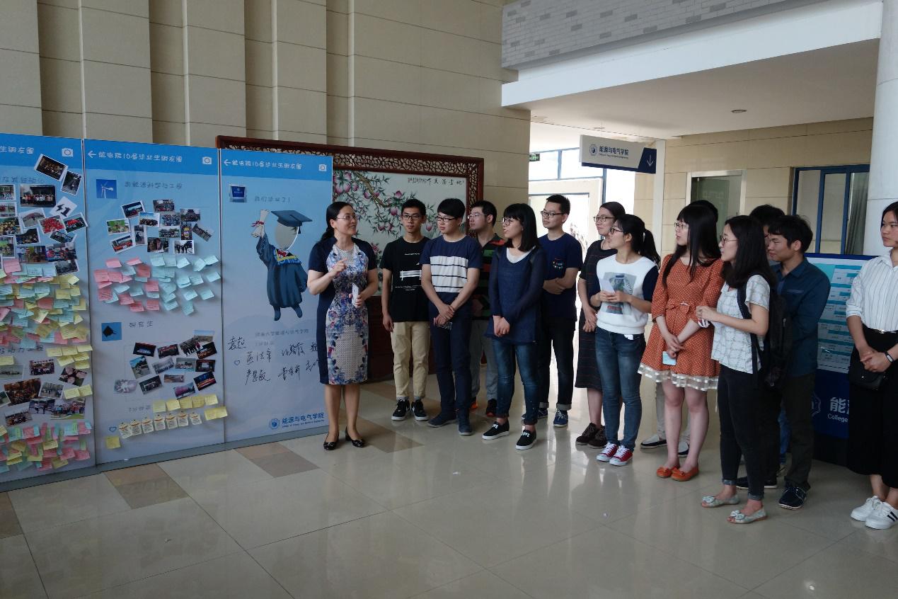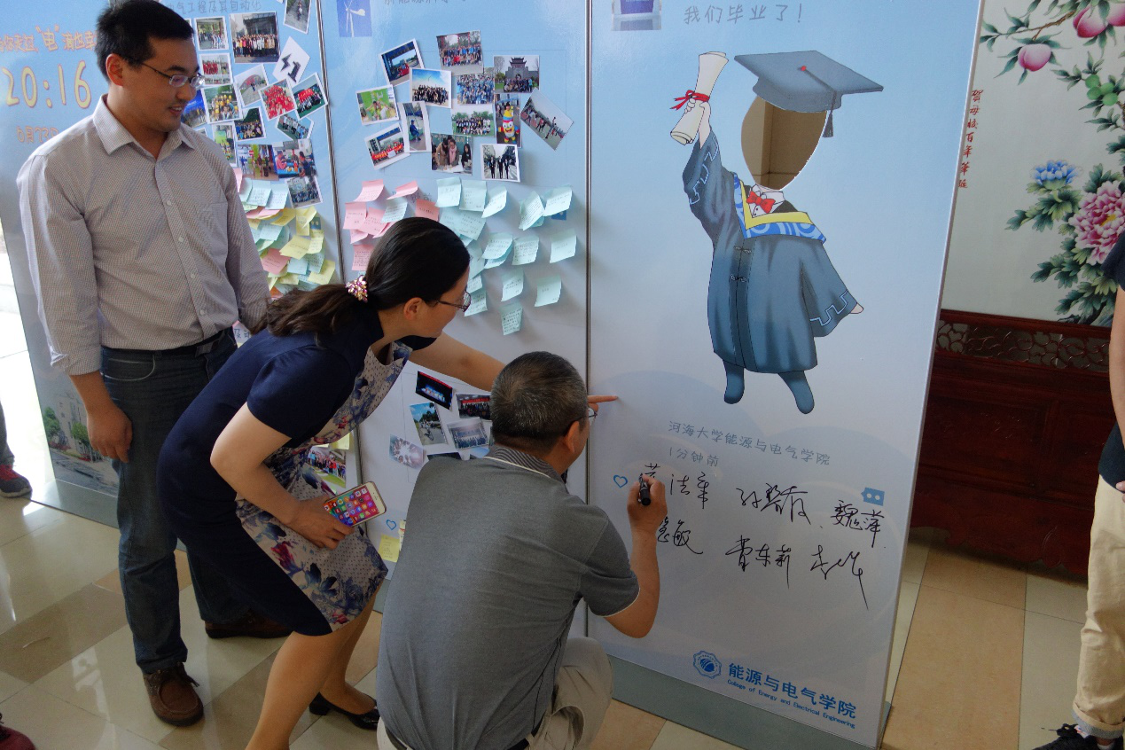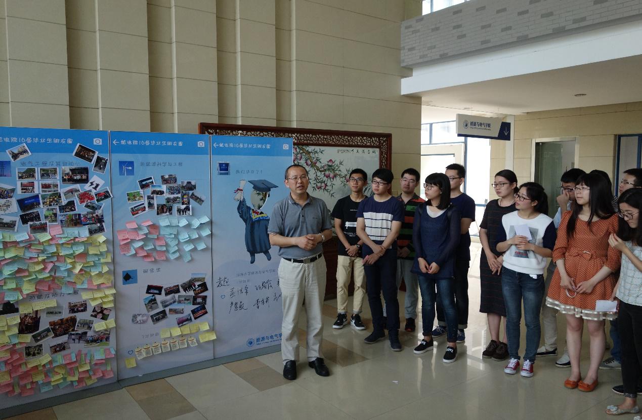 活动中,同学们在照片墙上粘贴班级或者自己最具代表性的珍贵照片,且贴上了每位同学写下的祝福语。有的同学写下了对未来的期盼、有的表达了对母校的怀念、更多同学写下的是对老师和同学的祝福。汤鸣鸿副书记介绍了此次活动的内容和意义袁越院长希望16届毕业生无论是工作还是升学,要再接再厉,在未来努力成为一名能电院的优秀校友。魏萍书记祝福16届毕业生前程似锦,希望大家毕业后能常回能电院看看。领导和老师们均在照片墙上签名点赞。活动最后,所有参与人员一起与照片墙合影留念。