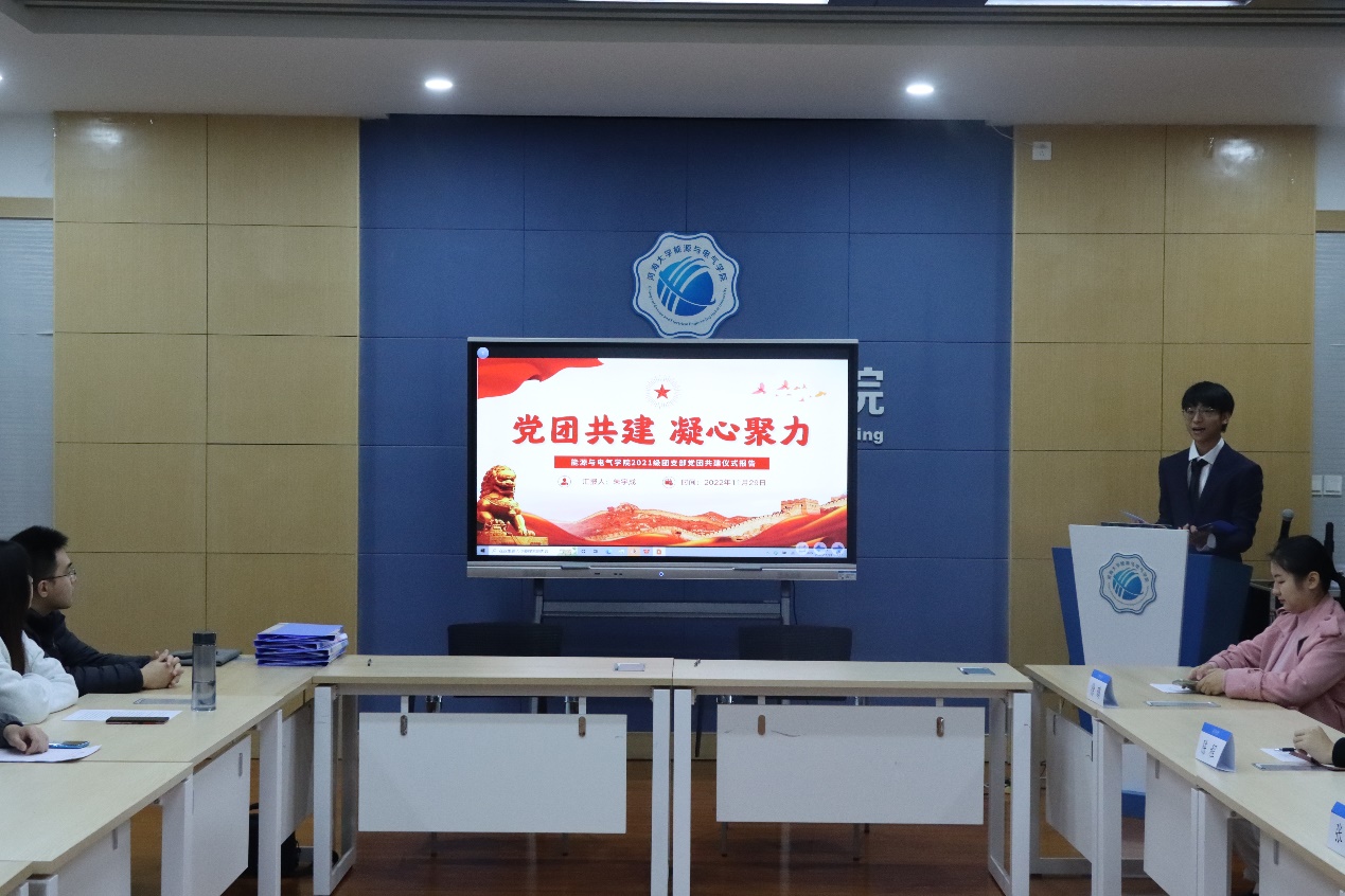 本科2021级年级团支书朱宇成,2022级年级团支书徐婧璇介绍了团支部工作概况,强调团支部建设过程中思想引领的作用,展现了支部丰富多彩的素质拓展特色活动,并对党团支部共建提出了党团员互动、工作互助、经验共享等建议。