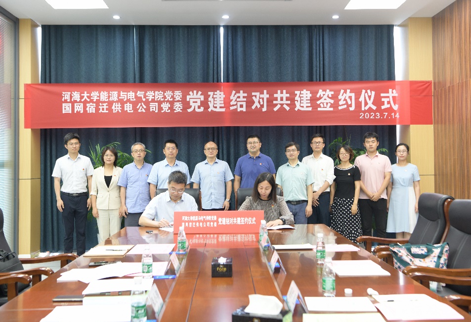 进一步加强创新型人才培养,深化校企合作,促进产教科教融合,近日,能电院前往国网宿迁供电公司开展调研交流,签署党建结对共建协议。能电院党委书记吴洪彪、副院长潘学萍、宿迁电力公司党委书记张小涛、副总经理李勇出席了活动,能电院教师党员代表、宿迁供电公司党建部、科技数字化部党员代表参加了活动。