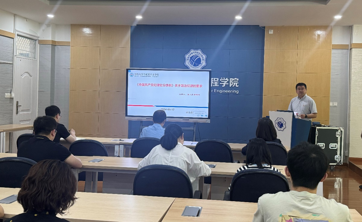 5月17日,javHiHi 举行《中国共产党纪律处分条例》(以下简称《条例》)专题辅导报告会,马克思主义学院副教授董大亮作辅导报告。学校党纪学习教育联络员刘丹平书记、学院领导班子成员、党委委员、党支部书记、师生党员代表等参加了报告会,院党委书记吴洪彪主持报告会。