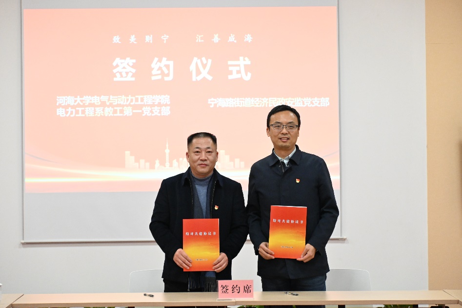 宁海路街道办主任吴宏对支部共建表示欢迎,电力工程系教工第一党支部书记刘皓明、宁海路街道经济民政安监党支部书记杨贤益分别介绍了支部工作情况,双方希望以“校地联动、合创共赢”为宗旨,建立健全互帮互助机制,实现双方组织共建、人才共育、资源共享、发展共赢的目标,形成双方互动、优势互补、共同提高的工作格局。