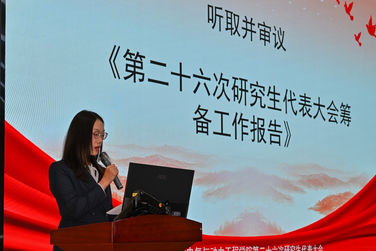 第二十五届研究生会主席团成员郭一畅代表上一届院研究生会,作了题为《责任与使命同在,青春与梦想齐飞》的工作报告,全面梳理了过去一年的工作实践与成果,号召新一届成员在后续工作中进一步完善工作机制、促进交流沟通、加强品牌建设,推动研究生会工作迈上新台阶。