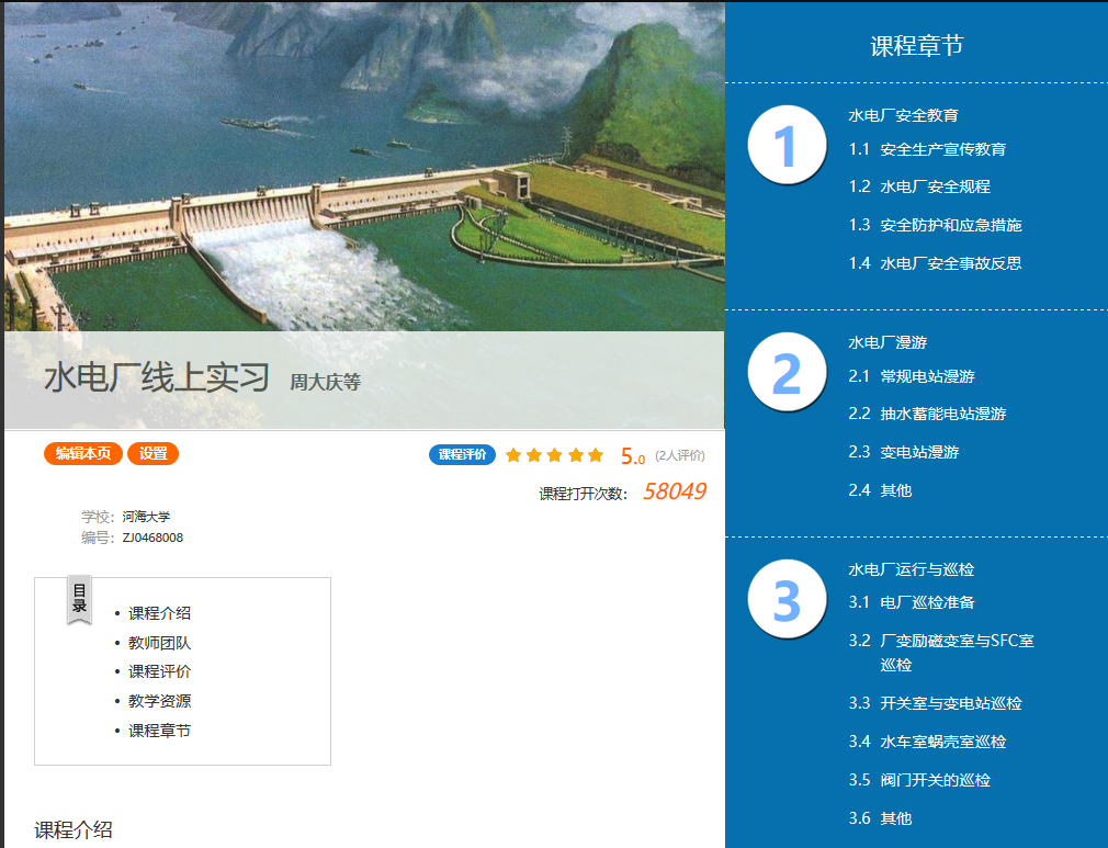一场突如其来的疫情不仅打乱了正常的教学秩序,也让学生正常的实践实习变得遥不可及。为了保证学生的课程有质量、实习有新意,能源与电气学院及时组织骨干教师对开学即将面临的教学和实践实习工作进行了研讨和预判,充分考虑学期实践实习的多变因素,未雨绸缪,精心筹建,建立了一支由多专业教师参与的实习“金课”团队,利用河海大学课堂在线网络教学平台,历经2个月时间完成整体课程的搭建、模拟、调试和试运行,让“水电厂线上实习”课程在线上“活”起来。整个课程主要分为“水电厂安全教育”、“水电厂漫游”、“水电厂运行与检修”、“水电厂主机设备安装与拆卸”、“水下航行器虚拟仿真”五大主体板块以及补充板块“水电厂工作生活花絮”。各大主体板块不仅提供了相关内容的基本文本和图片介绍,更通过虚拟仿真、三维漫游、线上随堂测试、师生线上互动的方式来形象介绍和巩固水电厂相关知识要点,学生足不出户就可以完成实践实习!
